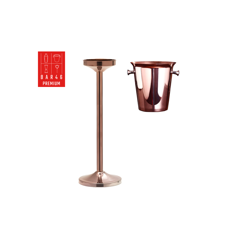Luxury table-side presentation set with a copper-plated Riviera stand (73.5 cm) and a matching copper-plated 5 L wine bucket with knob handles. Ideal for hotels, restaurants, lounges, and events—excellent choice when you want to buy bartender equipment in Dubai for premium beverage service.