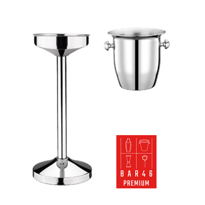 Elegant stainless steel set wine bucket with handle and stand – perfect for restaurant and hotel service.