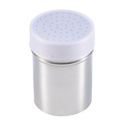 With dimensions of 7cm diameter × 10cm height and a light 100g build, it provides easy handling for bartenders and chefs. The fitted white plastic cover keeps contents fresh and protected, making it ideal for dispensing sugar, cocoa, cinnamon, nutmeg, or fine spices during service.